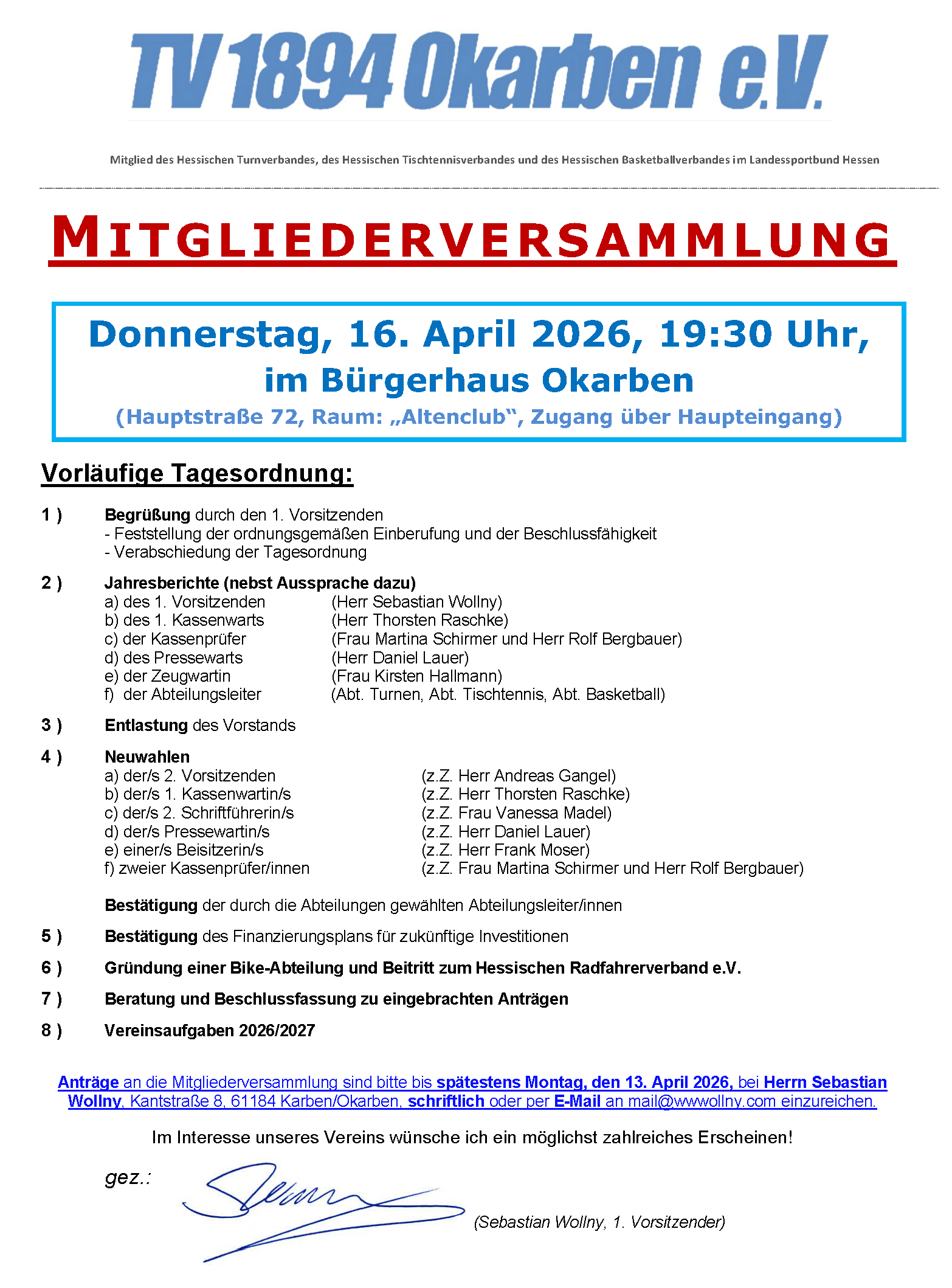 Hiermit lade ich ganz herzlich zur Jahreshauptversammlung 2026 am Do, 16.04.26 um 19:30 Uhr in den "Altenclub" des Bürgerhauses Okarben ein und hoffe im Interesse unseres Vereins auf ein möglichst zahlreiches Erscheinen!